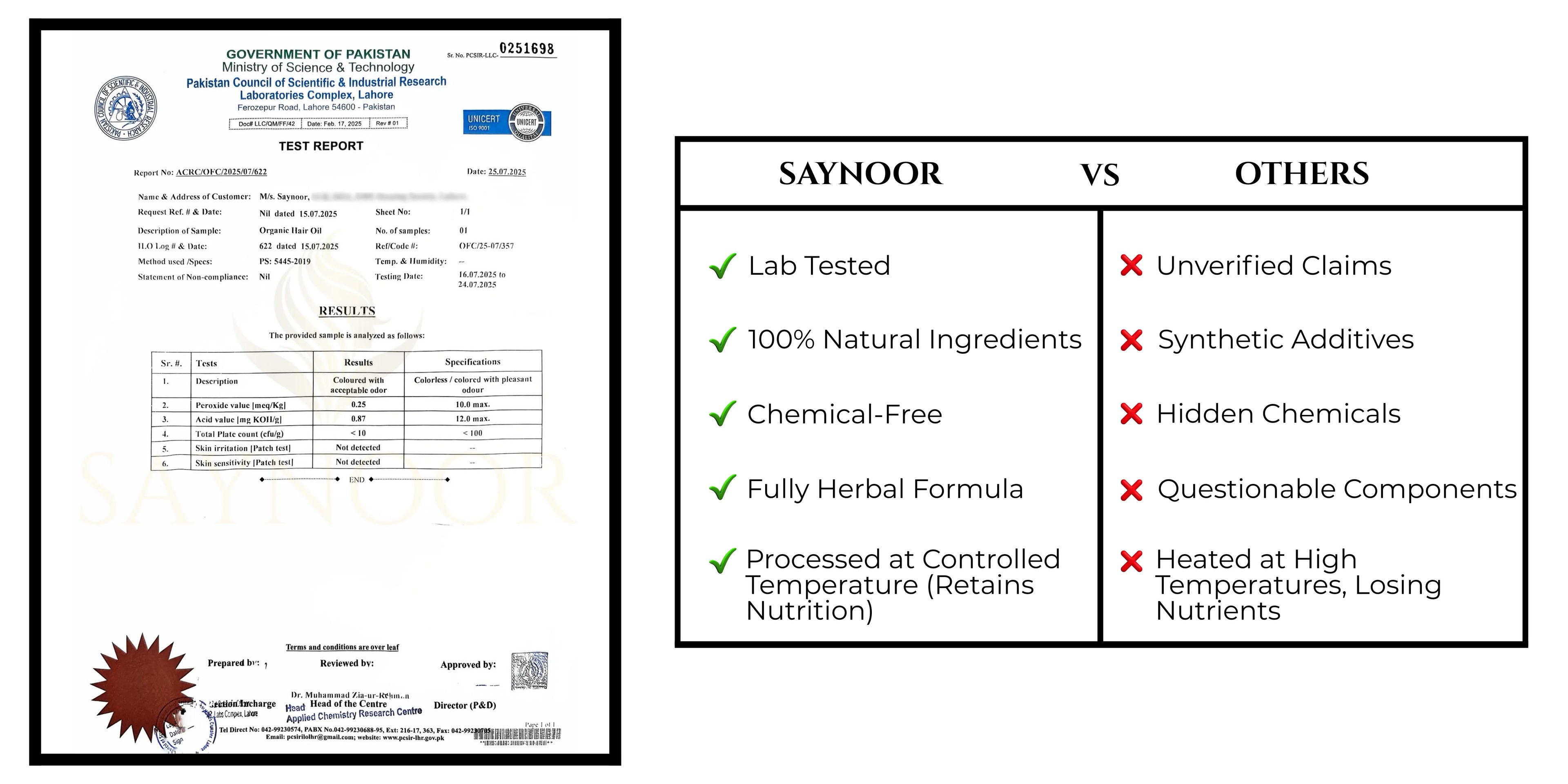 Saynoor combines traditional herbal knowledge with modern formulation. Our oil is 100% natural, chemical-free, and made in small batches for guaranteed freshness and quality.Tested and certified from PCSIR.