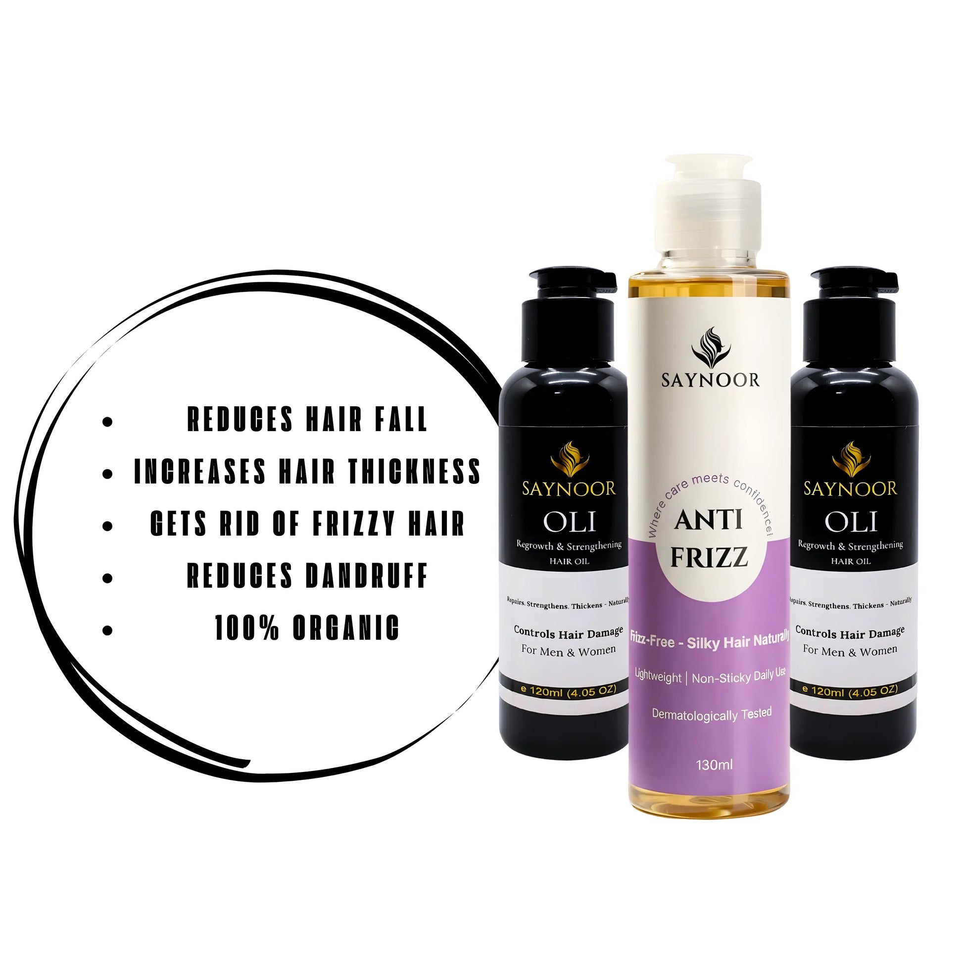 The kit includes a bottle of Saynoor OLI Hair Oil and a 540-pin Titanium Derma Roller (0.5mm). This combo helps stimulate hair follicles and enhances product absorption.